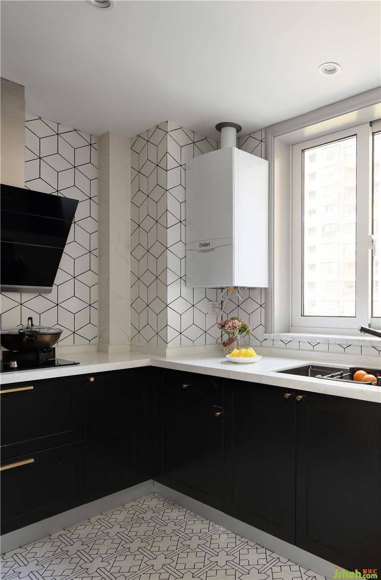 ▲中廚部分與西廚部分背靠,組成完整的廚房功能。中廚空間色調(diào)以黑白為主,視覺感統(tǒng)一。墻面的幾何線條磚和地面花磚打破了黑白配色的沉悶感,讓中式廚房也可以有趣起來~