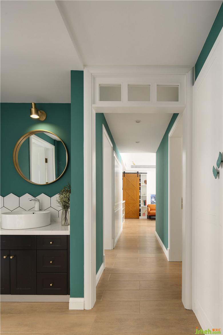 ▲走道空間綠白亮色的搭配,給人以利落、清爽的視覺感受。門體、門套以及踢腳線皆為白色。設(shè)計(jì)師為了改善通道過長的問題,在走道中部位置增加了一道門做分割作用,門楣部分采用木格樣式,起裝飾作用的也增加通透感,虛實(shí)結(jié)合又不失美貌。注意到了嗎?一道半開的門體上屋主還為家里的貓主子也留了一道門,鏟屎官們都要有這個覺悟才好~