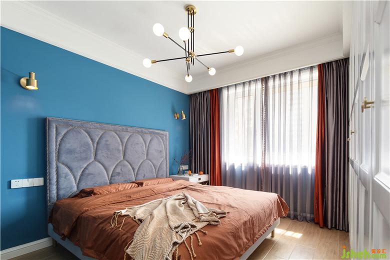 ▲主臥部分設(shè)計(jì)師墻體采用了藍(lán)、白的配色,軟裝部分的灰與紅沖淡了冷清,只留下一屋復(fù)古、沉靜與柔情的氣息。燈飾部分的黃銅色與不規(guī)則形狀也為空間增添了年輕感。