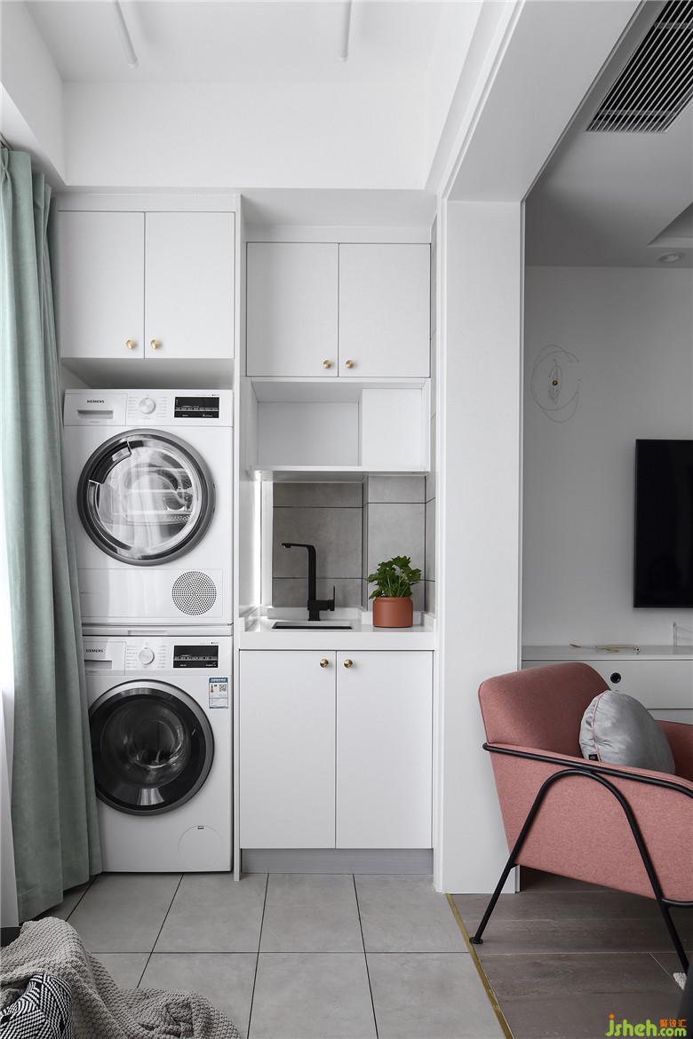 衛(wèi)生間干區(qū)不規(guī)則拼貼的六角地磚從地面綿延到墻上,與客廳的極簡掛鐘相映成趣,家就是從這樣的角度可愛起來。