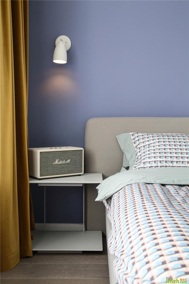 藍色的墻體揭開主臥的小北歐氣質,角落也不缺特別的細節(jié),床頭兩側的不對稱床頭柜和不對稱燈飾將趣味滲透進空間,姜黃色的絨面窗簾融化藍色冷感給主臥添上復古的韻腳。