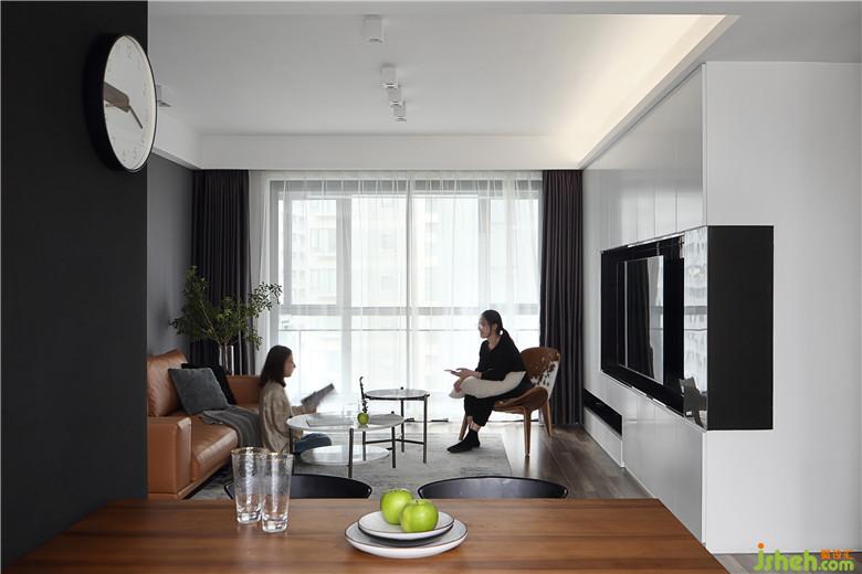 ▲電視背景墻是大塊面的黑白色搭配,強(qiáng)烈的對比兼具了視覺效果和實用性。白色的烤漆柜門提亮整個客廳區(qū)域,收納空間也足夠。黑色不銹鋼造型墻是帶來一抹現(xiàn)代氣息的鋒利感,不銹鋼并沒有選擇啞光的,黑色亮面的不銹鋼與白色啞光烤漆柜門組合,形成了鮮明卻不突兀的對比。下方不銹鋼抽槽將插座隱藏在里面,也可以做路由器或機(jī)頂盒的收納,保證了電視背景墻簡潔,完整的視覺效果。沙發(fā)旁的鐵藝書架,線條簡約流暢,也便于移動。