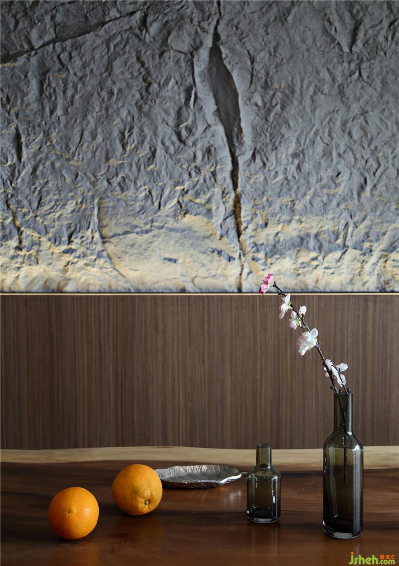 餐廳背景墻望去是極樸素的巖石形態(tài),與四周的胡桃木色相配,散發(fā)著沉靜的氣息。設計實現(xiàn)的過程,不同的材料的組合,玻璃纖維塑造巖石的紋理、起伏,石粉覆蓋,點綴在屋間便是天然去雕飾的氣息。內嵌的燈帶光線并不搶眼,是十分和諧的裝飾與背景墻融為一體。