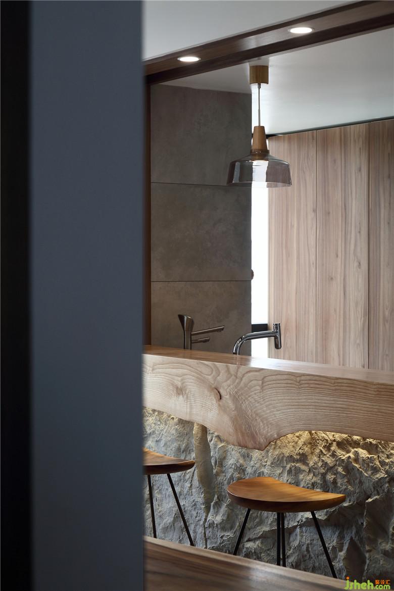 餐廳與廚房相鄰的一側做了半開放式與吧臺結合的設計,室內設計師用餐空間得到了提升也豐富了用餐形式。木質的吧臺臺面下緣并不平整,連接仿真石材的裝飾與卡座部分的墻面呼應。