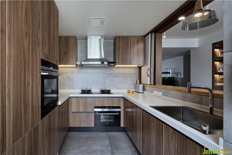 廚房三面皆有櫥柜,收納功能齊全。做煙火氣稍多的中餐時廚房和餐廳也有軟簾可以開放隔離,生活方式的多種選擇,也是這個家的包容所在。