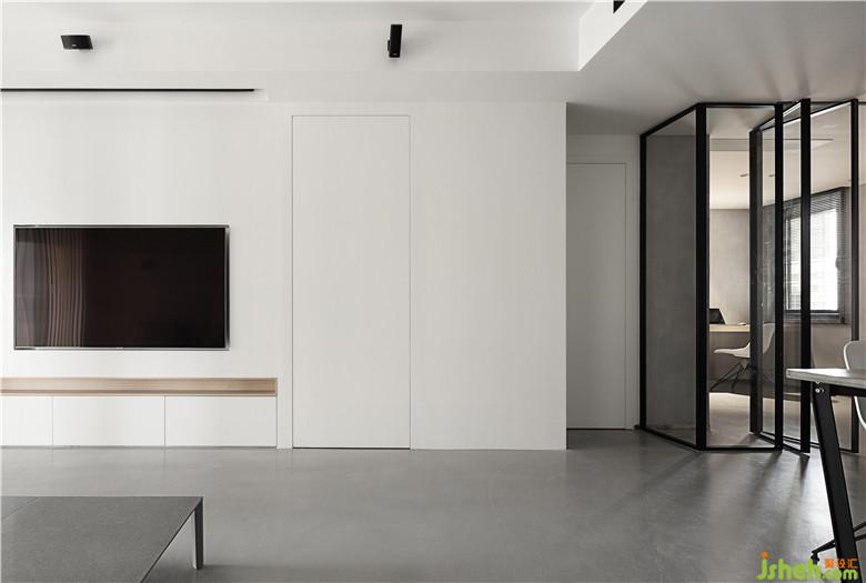 ▲電視背景墻與收納柜結(jié)合,皆采用白色混油木面裝飾,下部原木色的抽槽打破整面白色的空洞,帶來暖色調(diào)的溫潤。主臥的門藏在電視背景墻的一側(cè),室內(nèi)設(shè)計師選用同色系的隱形門,美觀之下又和諧的隠于整個空間的極簡風格中。