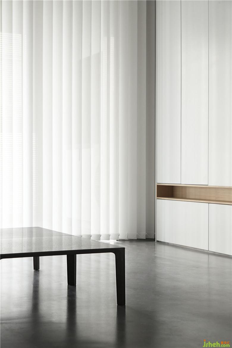 同樣低矮造型的水泥制茶幾,纖細(xì)的造型像圍棋桌的既視感,雖然處于空蕩之中,卻散發(fā)出冷靜的感覺。