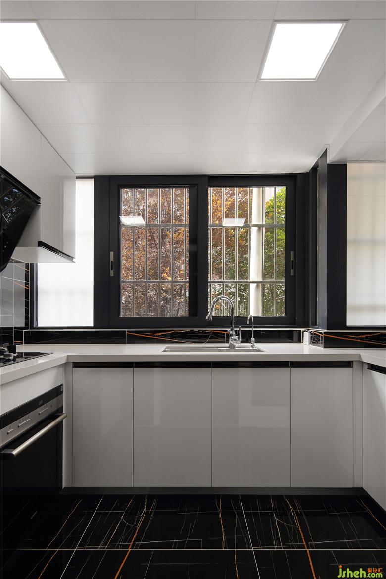 ▲陽臺改造的廚房空間在黑白之下格外明亮,u字形的操作臺面將空間充分利用,櫥柜選擇亮面烤漆配合暗拉手,小空間中過多的零碎即是累贅。