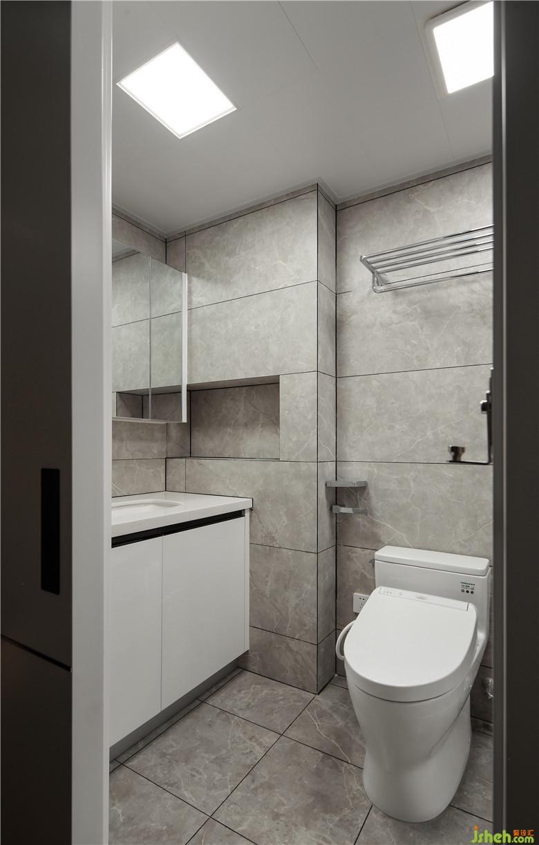 ▲衛(wèi)生間選用移門,節(jié)省空間留給功能需求。由于衛(wèi)生間空間的擴(kuò)充,功能分區(qū)得以很從容地實(shí)現(xiàn)。白色烤漆浴室柜延續(xù)櫥柜的暗拉手選擇,墻側(cè)利用壁龕增加儲物空間。