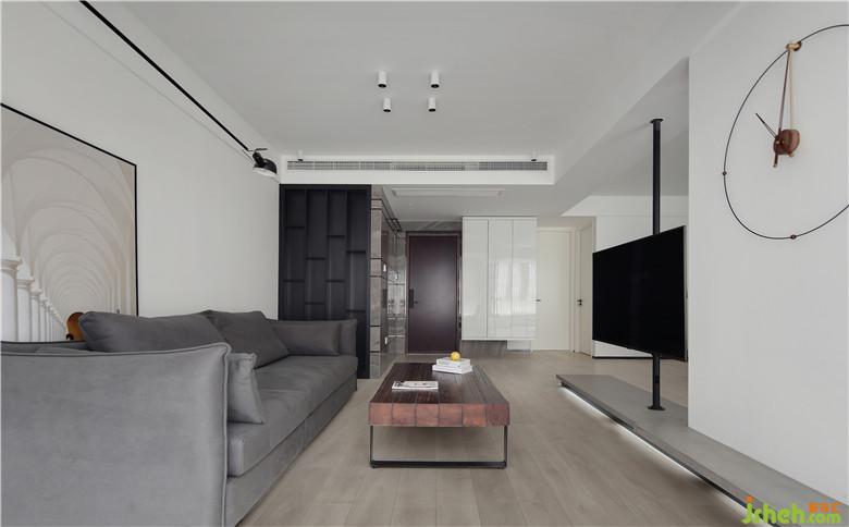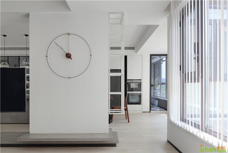 ▲入戶處的白色亮面烤漆柜體選擇了通頂不落地的形式,下方可以收納鞋物,方便進(jìn)出門。沙發(fā)一側(cè)沿凸出的墻體打一組開放式收納柜,啞光的黑色,讓視覺效果更豐富,也補(bǔ)充了收納功能。