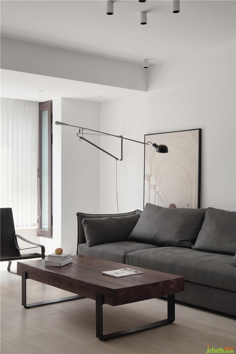 ▲簡(jiǎn)單的光源布置,有主次、遠(yuǎn)近,足以在夜晚滿足照明需求與烘托氣氛。深灰的絨面沙發(fā)搭配皮質(zhì)、纖薄的靠椅,與深色的茶幾的搭配是淺色空間中深邃的沉淀。