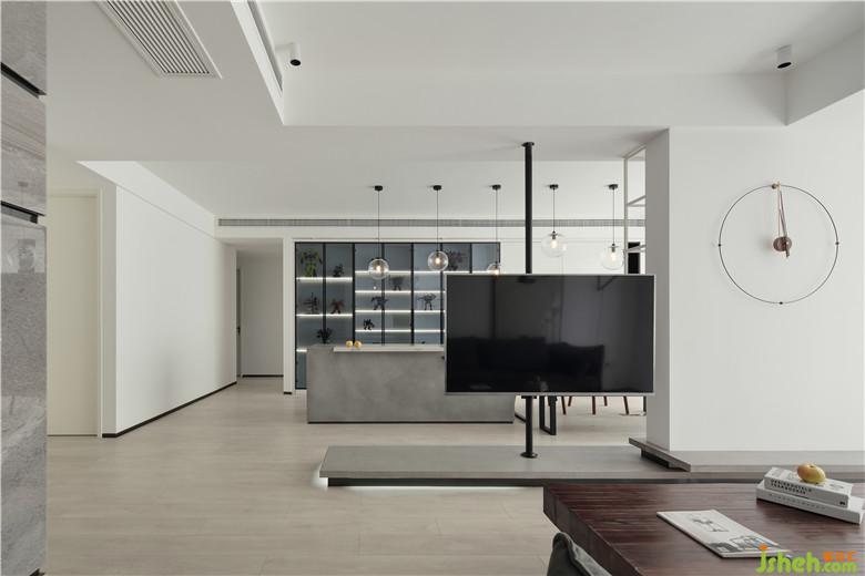 ▲半開放的電視背景墻,以煙火氣的生活為背景就是最溫馨的日常。摒棄了大部分的墻體,也沒有選擇功能性的電視柜,而是利用地臺(tái)的層疊帶來造型上的變化,電視固定在定制的柱子上,柱子空心可以將線纜內(nèi)藏入其中,將通透感歸還于整個(gè)公共空間。
