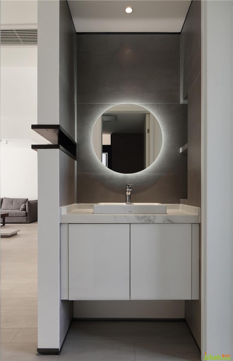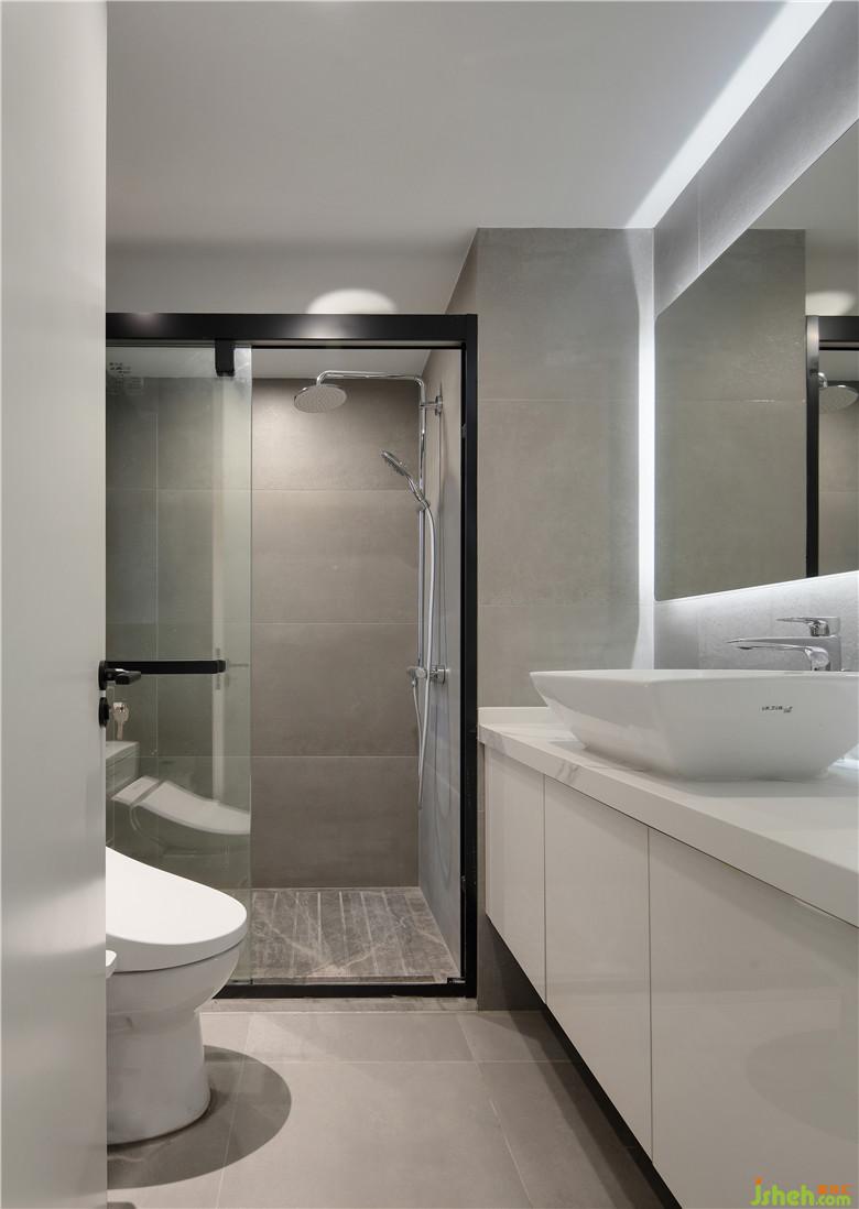 ▲主衛(wèi)在空間上沒有做干濕分離,利用顏色白與灰做了功能的區(qū)分。