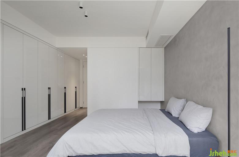 ▲墻體向餐廳的推移,為主臥留出足夠柜體空間,收納柜選用白色烤漆柜門,落地柜采用黑色長拉手避免白色過多的蒼白感。