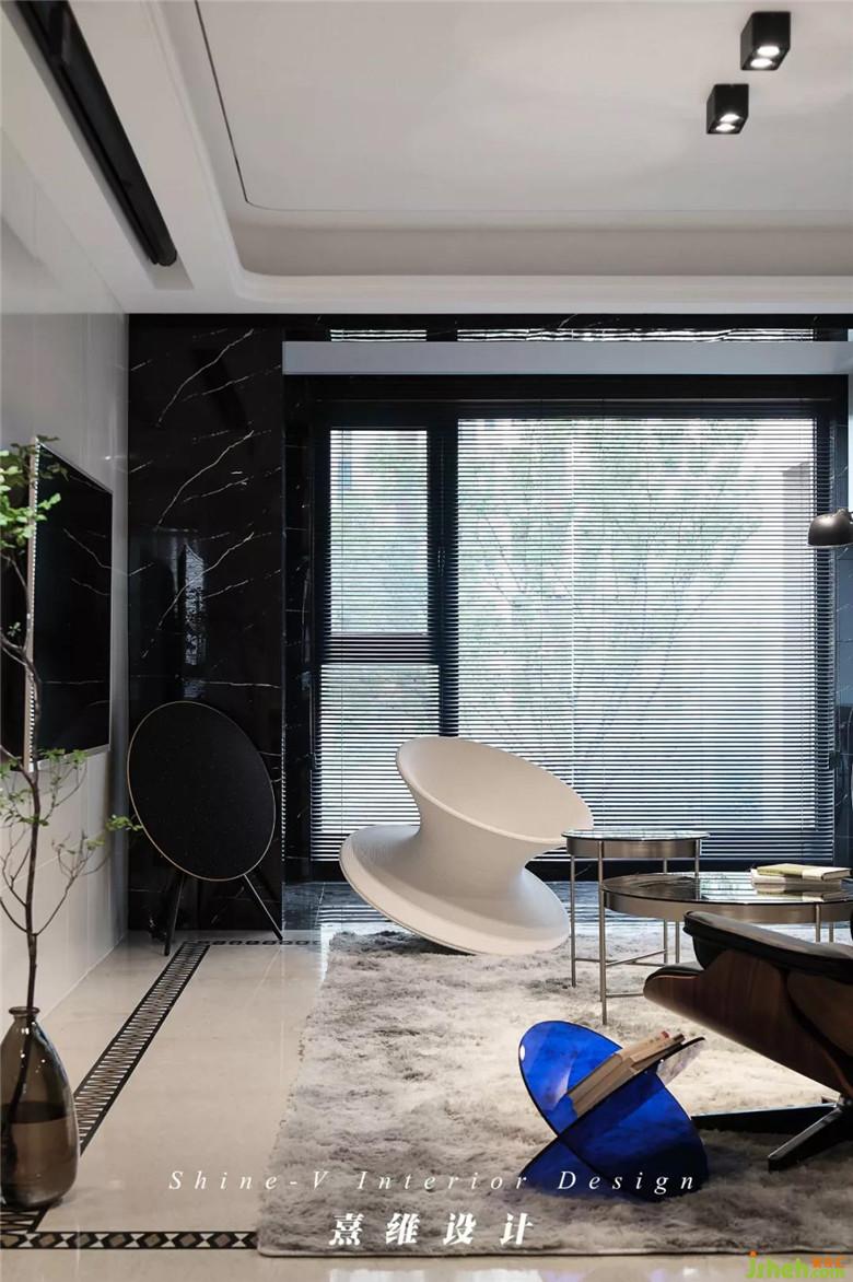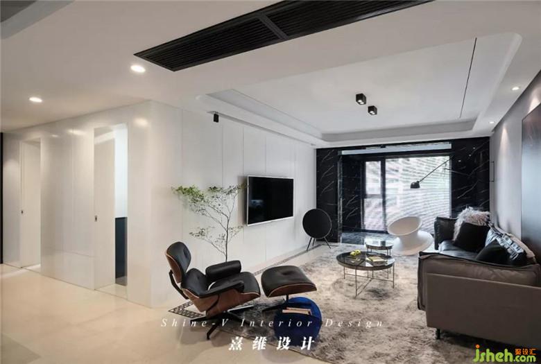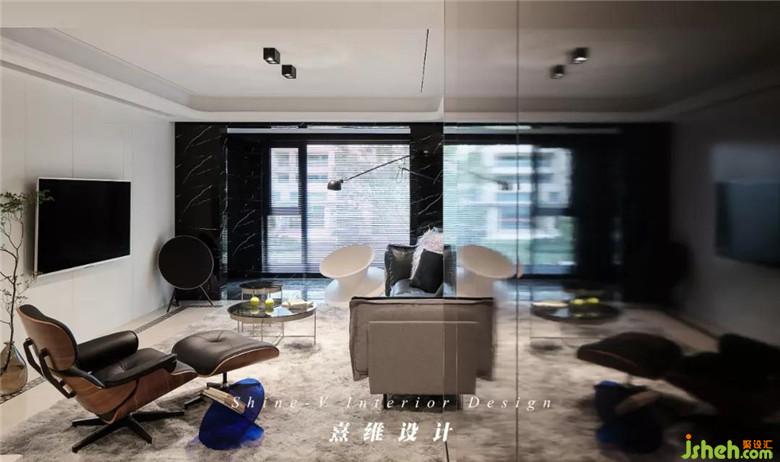 皮質的沙發(fā)輪廓分明,灰黑的配色與白色電視背景墻相對,視覺感更具張力。帶腳凳的伊姆斯椅,符合人體工程學的設計配合內側的皮質軟墊,是復古的輕奢兼具現代外型的自由體驗。