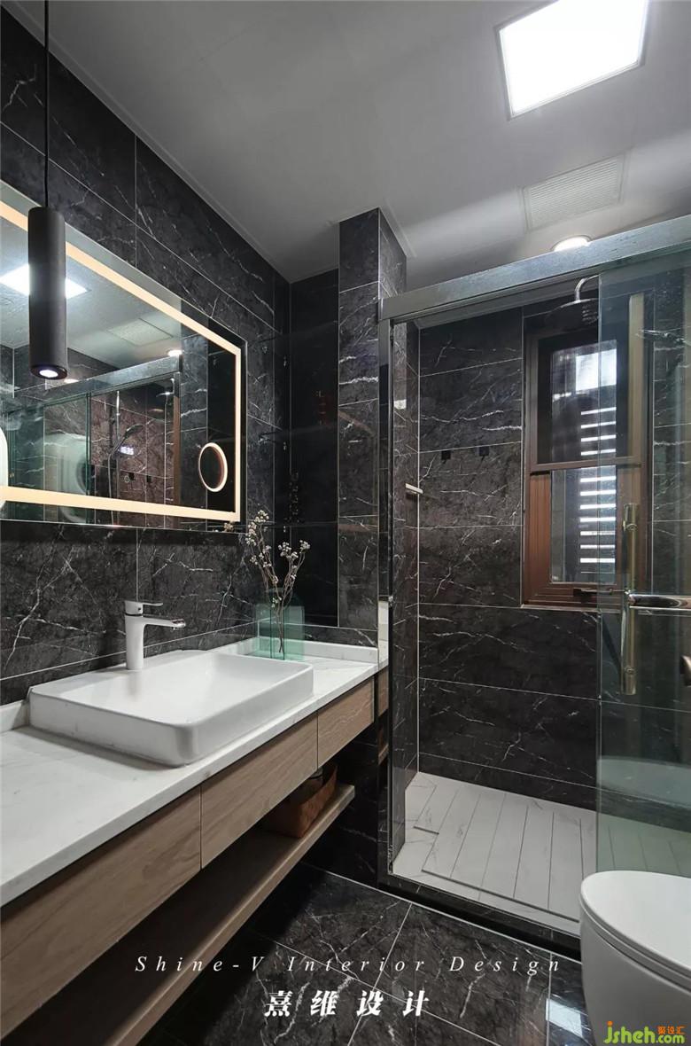 ▲深色瓷磚鋪貼的客衛(wèi),營造出一種私密的氛圍。造型簡潔,顏色清淡的浴室柜與壁龕涵蓋了衛(wèi)生間所需要的所以收納空間。裝修公司