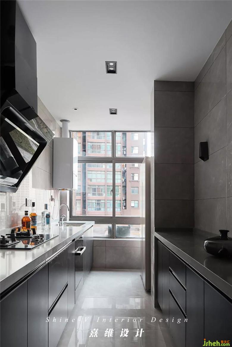 ▲陽臺空間納入讓廚房空間變得狹長,摒棄吊柜,讓光線盡可能多的撒入室內(nèi)。