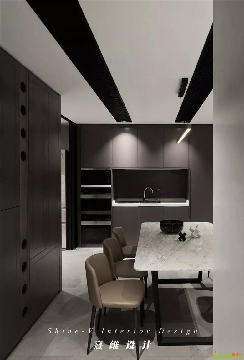餐桌的兩側(cè)設(shè)立多功能柜體。酒柜、日常雜物柜、蒸烤箱一體柜、吊柜以及補(bǔ)充功能的島臺(tái),最具煙火氣的實(shí)用在這里被明確下來(lái)。