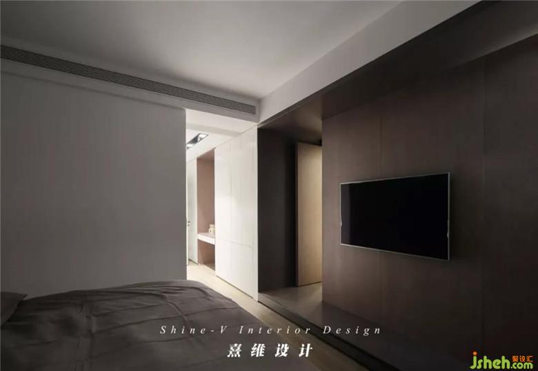 ▲多了一扇門的主臥,去往客廳、陽臺不再需要兜一大圈。由客廳中延續(xù)而來的胡桃木雙飾面鋪陳在主臥的電視背景墻上,木色在夜晚更顯沉郁,浮躁被摒棄,沉浸在專注平和里,不受外物干擾。