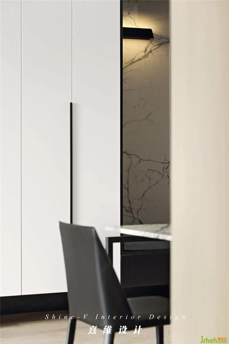 ▲柜體之間空出一截作為換鞋凳使用,內(nèi)嵌與電視背景墻同材的裝飾板,這種呼應(yīng)讓空間內(nèi)的聯(lián)系更加緊密融洽。大理石裝飾板上添置一處隱藏光源,雖不顯眼,卻可以守候在晚歸的夜里。