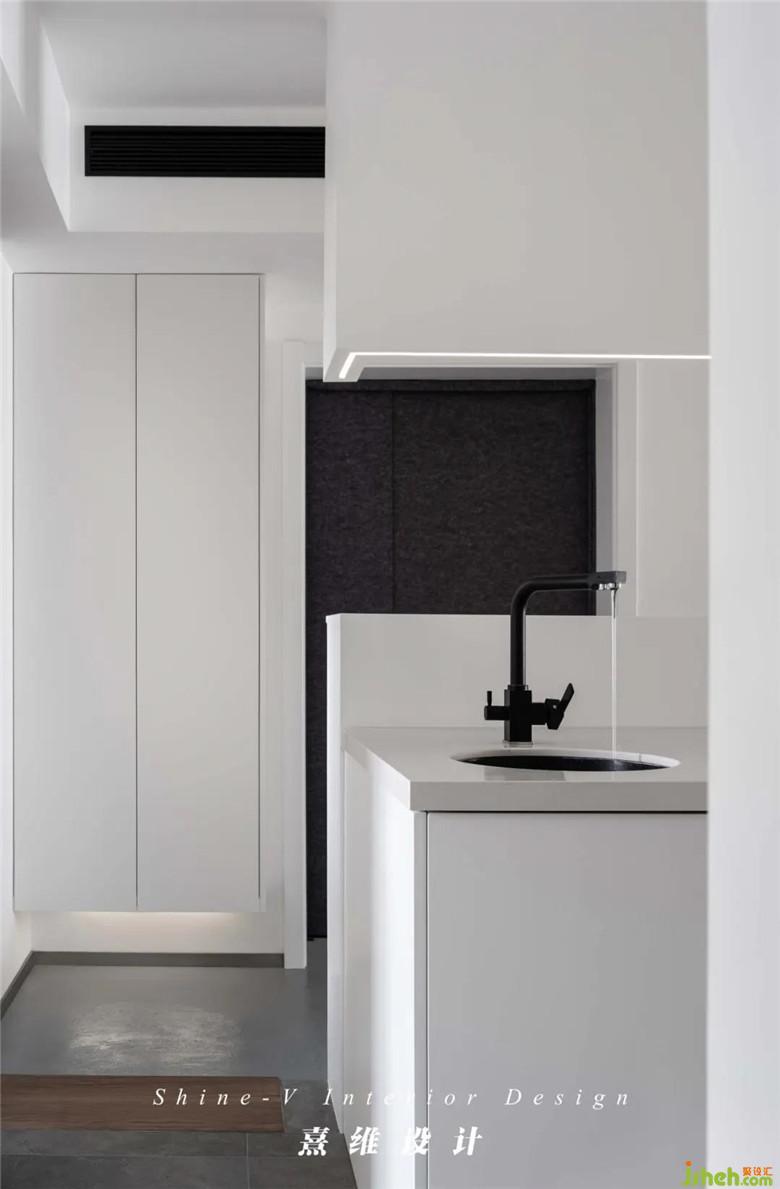 ▲門邊的柜子,裝修公司為玄關區(qū)域補全與周圍的白凈相匹配的——足夠的收納。半隔斷底部嵌入的燈帶是微不可察的細節(jié),卻是家中才有的面面俱到。