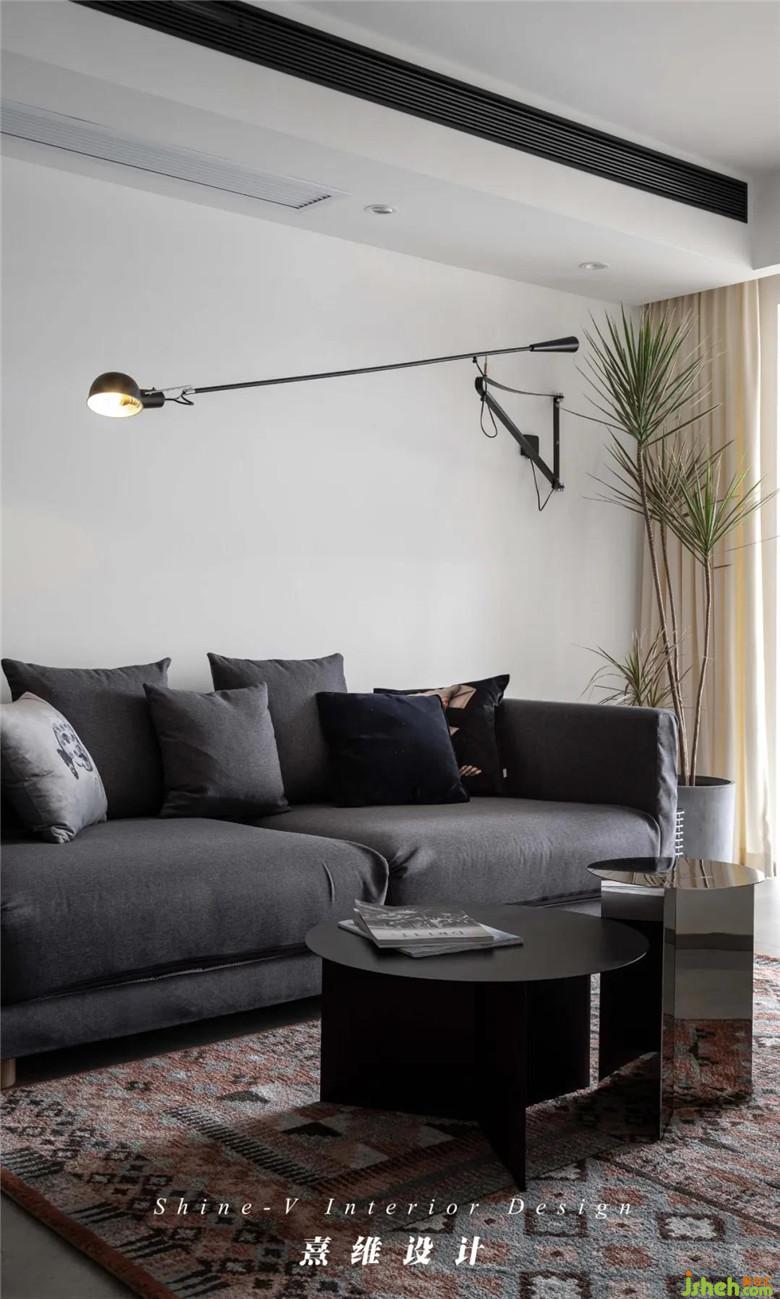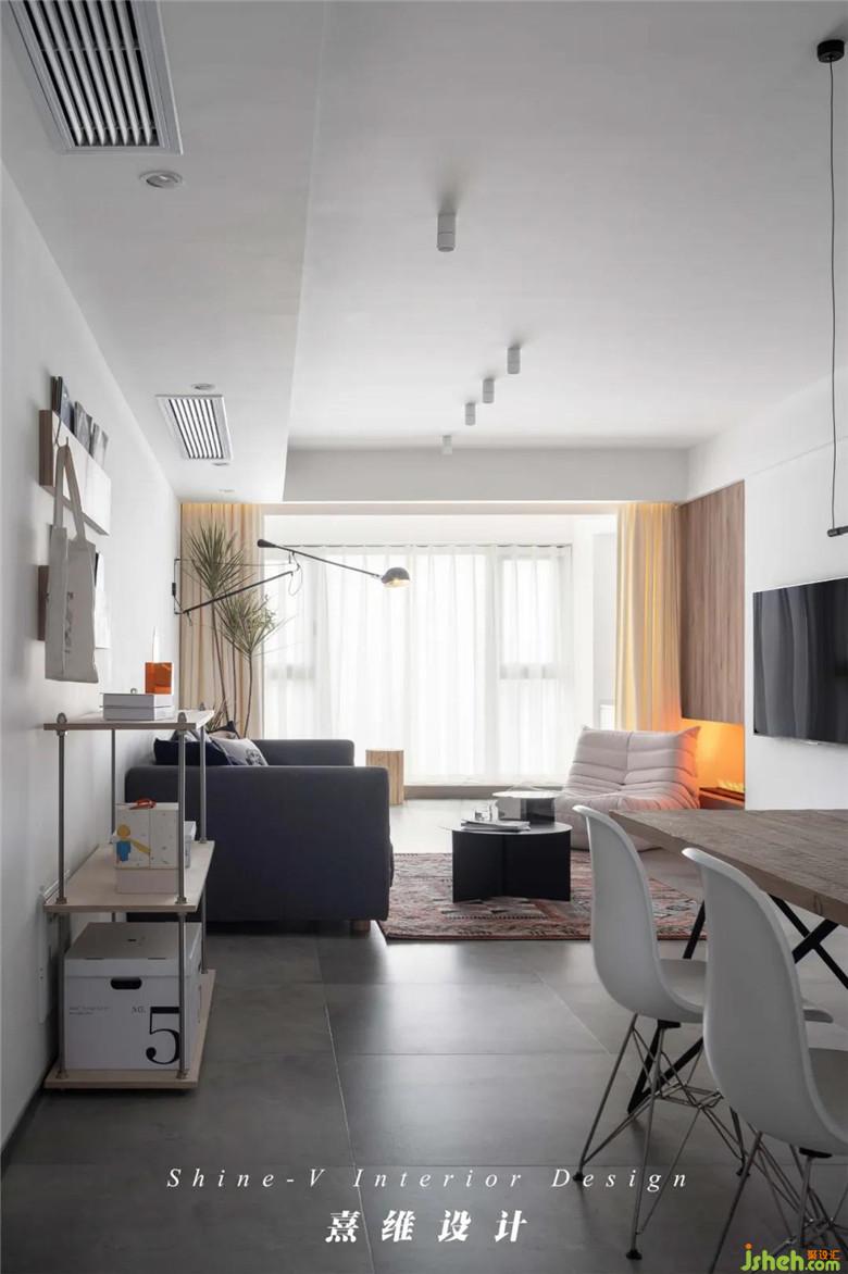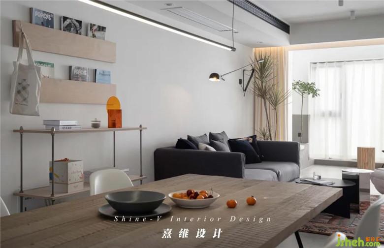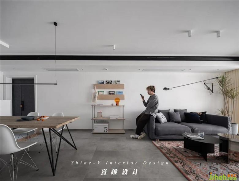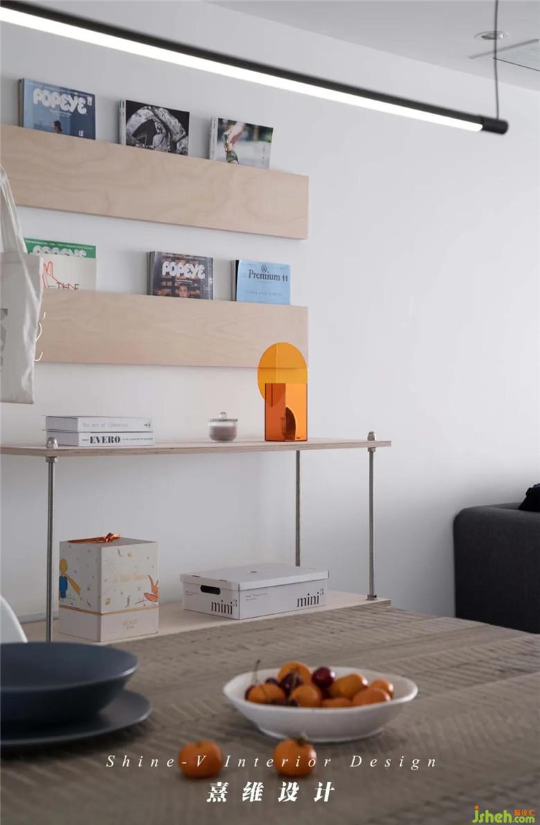 ▲鋼木結構置物層架最大程度露出這個家中白的底色,保持了空間結構的自由感,不增添絲毫沉重。與墻面貼合的雜志架,溫柔原木色從置物架層板沿襲過去,功能性不是它的目的,裝修公司讓白墻不被冗余的功能附著,為空間帶來呼吸可聞的輕盈感受。