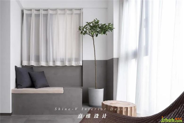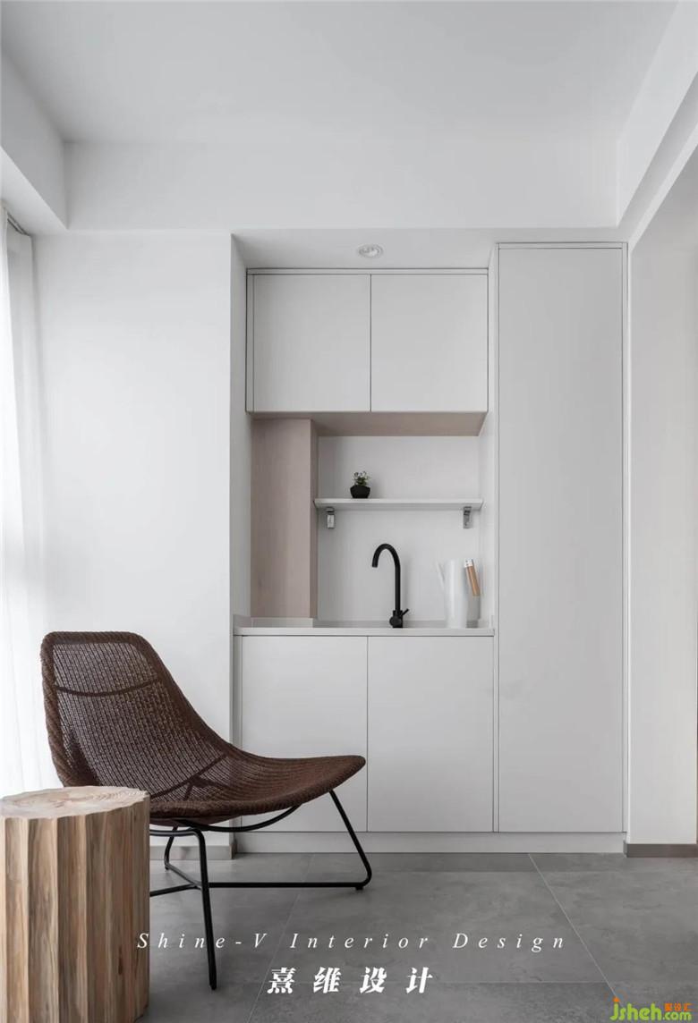 ▲業(yè)主對(duì)陽(yáng)臺(tái)的需求更傾向于休閑功能,故以此為主,裝修公司將洗衣機(jī)烘干機(jī)位置調(diào)整到原次衛(wèi)干區(qū)。陽(yáng)臺(tái)一側(cè)新砌地臺(tái),相對(duì)著擺放一張?zhí)倬幪梢?,身處其中可以感受到交流與放松的選擇更加多變。另一側(cè)是定制陽(yáng)臺(tái)柜,作為不影響主體休閑氛圍的功能性補(bǔ)充存在。以白色為主體降低存在感,融于全白的墻面之中。