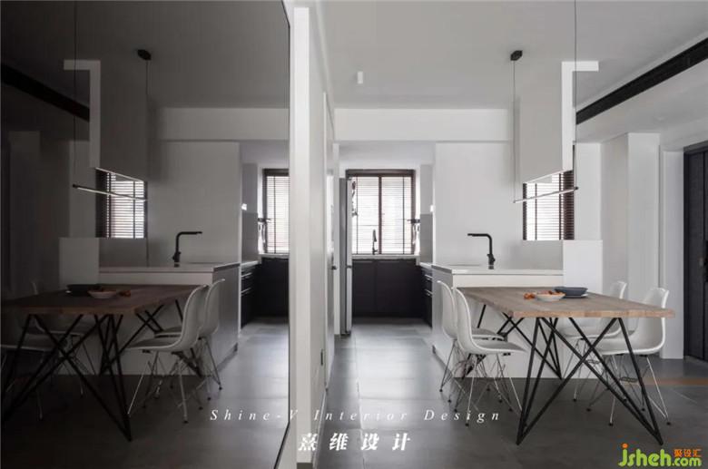▲餐桌椅的腿部線條不再是單純的支撐作用,他們同線性的吊燈一起,簡(jiǎn)練而有序的點(diǎn)綴白色內(nèi)的層次,空間滲入猶如雕塑般的輪廓分割。原木色的餐桌表面有生動(dòng)的紋理,打造此處豐富的空白,“隱性”的空相被“呈現(xiàn)”出空靈感,啟發(fā)人無(wú)限思緒。