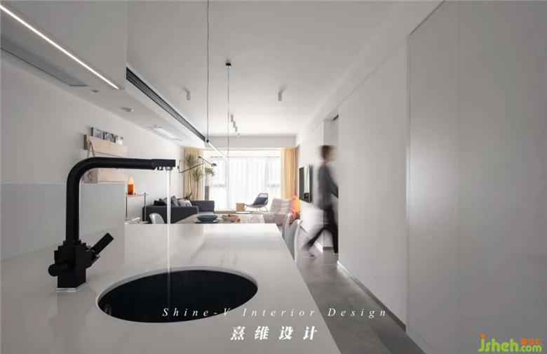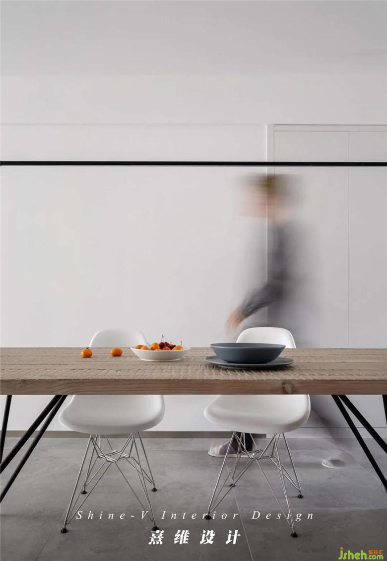 ▲“餐廚一體”是現(xiàn)代住宅中常見(jiàn)的生活場(chǎng)景,選擇這般滿目的白色、極簡(jiǎn)的線條保證了功能復(fù)合空間中的最佳的穩(wěn)定感與秩序感。