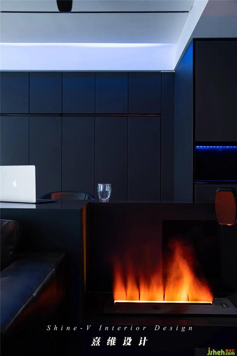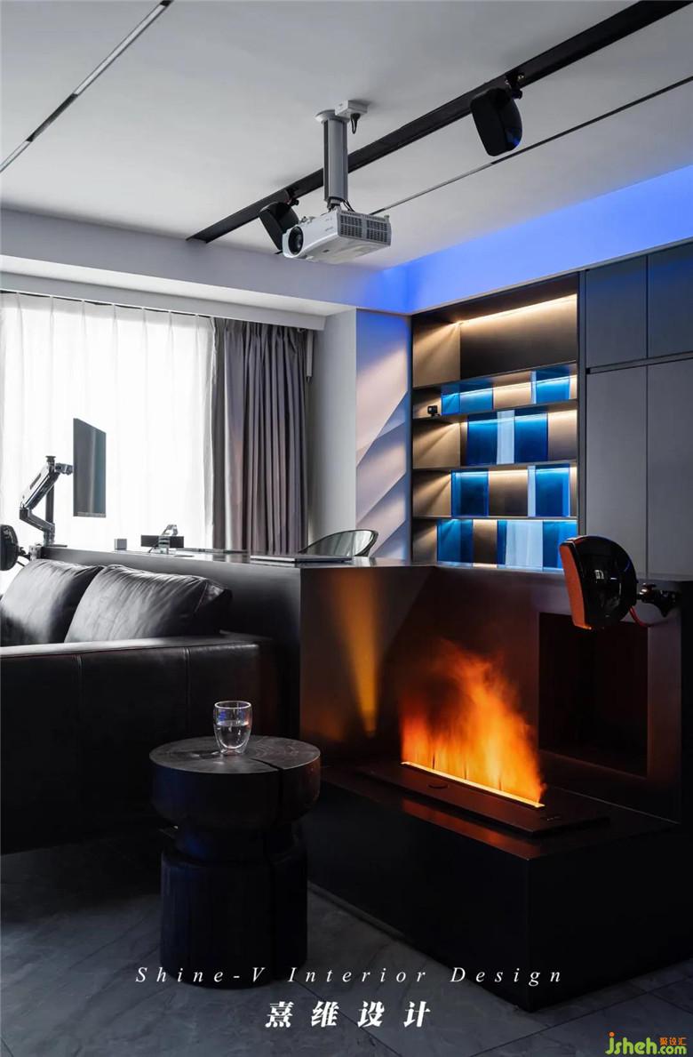 ▲工作區(qū)的柜體,一部分是開放柜,封閉樣式的另一部分其實是下翻床。開放柜內裝置上燈帶,擺上定制的亞克力小盒子,光透出來,這些不再是冷冰冰的幾何組合,傳達出一種持續(xù)性的、神秘的迷失感,像引人探索的科幻未來,格外適合家庭中小影院的低暗氛圍。