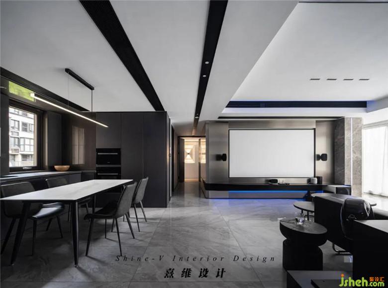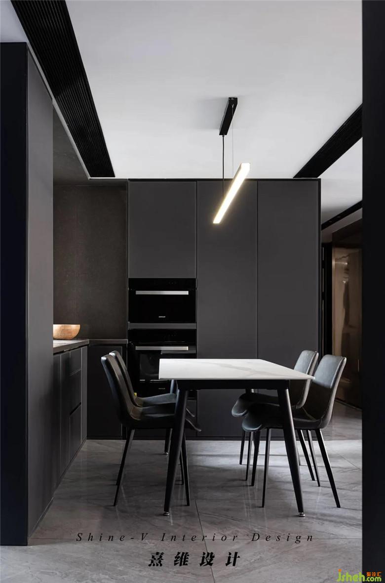 ▲裝修公司在保證餐桌的合理擺放以及過道的寬綽之后,避開獨(dú)立島臺(tái)占位較大的缺點(diǎn),根據(jù)實(shí)地環(huán)境,將島臺(tái)放置在鄰近窗戶的墻邊,不被遮擋的窗讓餐廳沐浴在多方位的自然光線之下,功能俱全,氛圍亦佳。