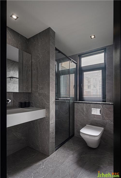 ▲客衛(wèi)空間相應(yīng)擴(kuò)寬,干濕區(qū)合并,利用新砌墻體的凹凸,使臺(tái)盆與淋浴區(qū)隔窄墻相鄰,墻排馬桶進(jìn)一步節(jié)省空間,明確合理的將功能規(guī)劃齊全。