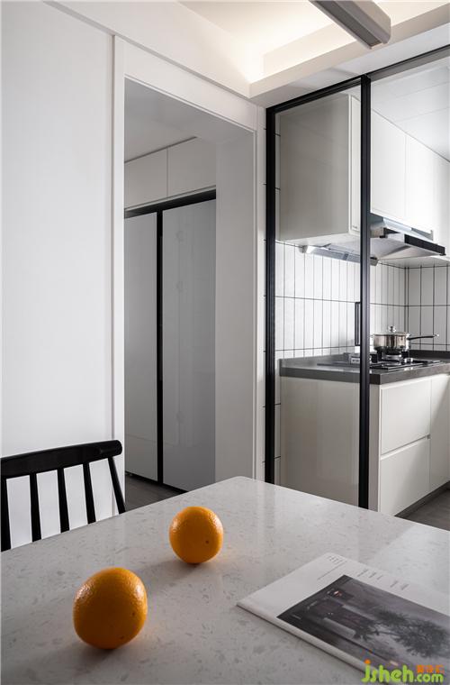 ▲餐廚同享一個空間,玻璃移門拉開一條透明的界限,為沒有窗戶的餐廳引入自然光。冰箱被嵌入通往主臥的走道邊緣,留給廚房足夠的空間擴(kuò)展出最實(shí)用的u型櫥柜、雙側(cè)吊柜。