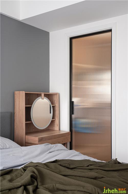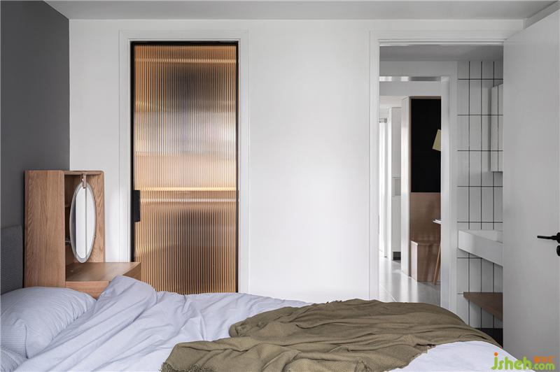 ▲主臥內(nèi)部劃出很小的衣帽間,小到更像是一個可以步入的衣柜,但容量更多。作為收納的場地,用長虹玻璃使內(nèi)部的場景朦朧,虛化成功能性的縮影,只留主臥被裁切后仍然規(guī)整的輪廓。