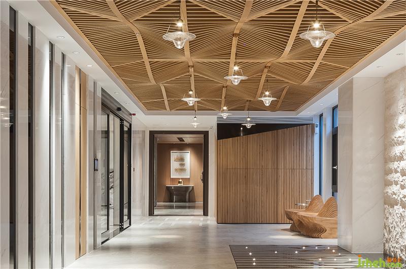 1、公共區(qū)域:以木質格欄作為主要元素的過道中庭,利用線條的曲折展現(xiàn)如海浪的形態(tài),再點綴以水滴造型的吊燈,讓空間充滿浪漫情境。亮燈后的效果光暈重疊,波光粼粼,與中庭的水景遙相呼應,別具詩情畫意。跳脫原戶型架構的限制,設計師解構空間功能,將會客、起居、用餐三個功能區(qū)集于一體,呈現(xiàn)脈絡清晰的生活動線。米色系的雅澹柔和,現(xiàn)代材質的輕奢質感,在空間巧妙糅合,日常生活情境與審美精神在同一范疇交融。