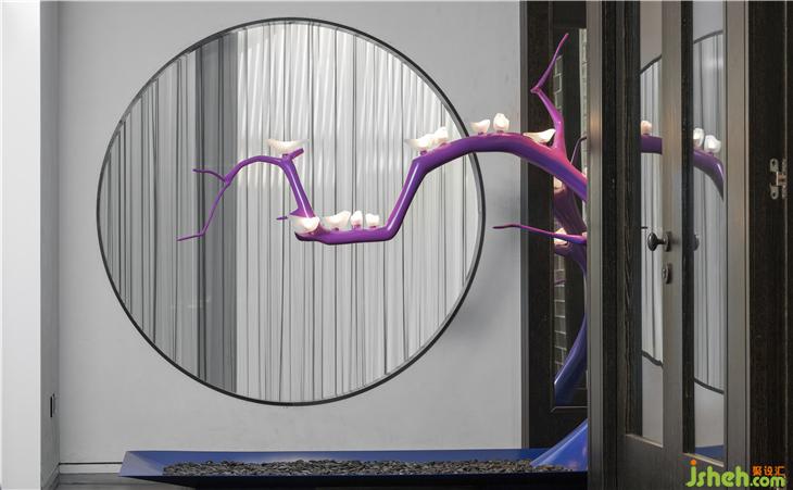 至二層,樹枝雕塑藝術(shù)品首入眼簾,將樹枝化為紅色,成為空間吸睛的一筆,顏色的對比成為具象與意象的界限轉(zhuǎn)換,具象則聞聲聲鳥啼,意向則寓生命不息。