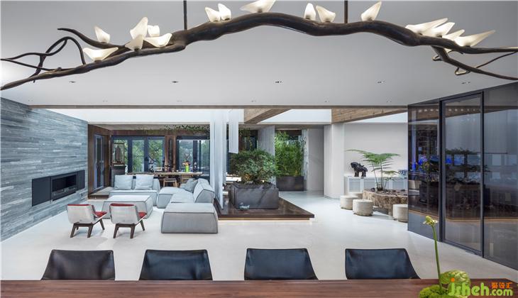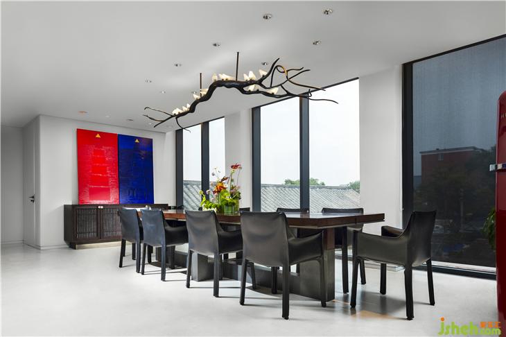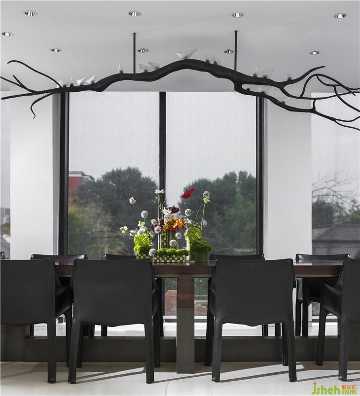 初極狹,才通人,復(fù)行數(shù)十步,豁然開朗。會(huì)客區(qū)域明朗開闊,右側(cè)為用餐區(qū),餐桌垂直上方以鳥形燈具作為藝術(shù)家原創(chuàng)作品,功能之外,藝術(shù)為先。