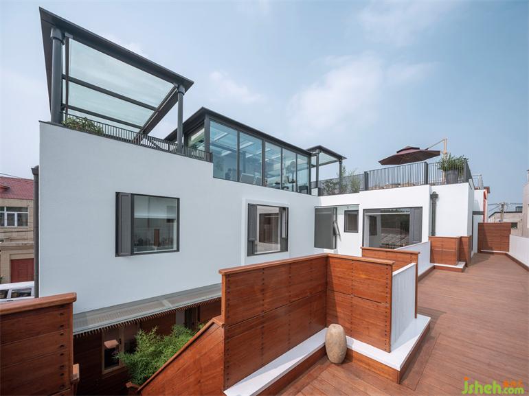 北京的天空有時候是灰蒙蒙的,大面積的白色墻面把底色凈化出來。別墅裝飾庭院里種植大量竹子表意東方,營造出區(qū)別于村鎮(zhèn)所在的另一個自然,像是北京對江南。無論陽光、雨水還是聲響都沒有被隔在外部,遠道而來的南方芭蕉和北方植物一起分享花房,新舊、內(nèi)外、南北、城鄉(xiāng)在進退皆有余地的表達下消融了邊界。