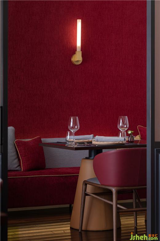 餐廳設(shè)計(jì)立面上,藝術(shù)涂料與壁布拉出層次;黑色金屬條勾勒邊緣,與渾厚結(jié)實(shí)的弧面線角形成律動(dòng);沿用老店具有識(shí)別性的紅,加以矯正后體現(xiàn)在絲綢、絲絨與皮革面料中;雀躍迷幻的紅、黃、藍(lán)多色燈光渲染出巴黎撩人的曖昧迷情;深胡桃地板依照法國(guó)規(guī)制鋪貼,與老店舊物一同將整個(gè)空間劇場(chǎng)拉入深沉背景中。