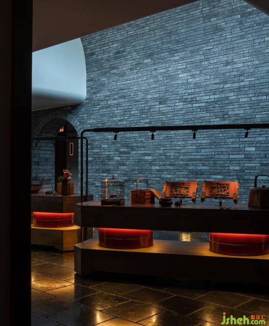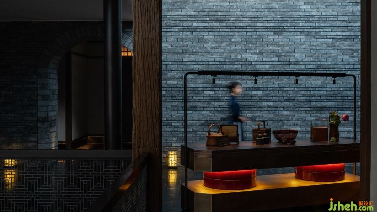 提籃陳列柜提示著一個(gè)不容薄待的大徽州,透過(guò)格柵,茶室在環(huán)游的盡頭靜待來(lái)客。
