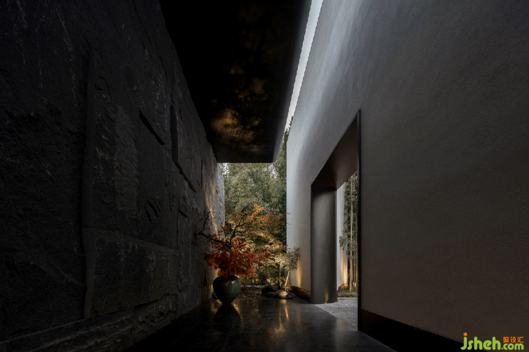 在人的高度和視線范圍內(nèi),內(nèi)和外的分隔被減省,腳下是堅實的大地,一側(cè)是樸茂沉雄如山巒的深色石壁,寬大的出檐形成屋蓋,光或雨的潮汐將由屋漏滴入內(nèi)外間隙。