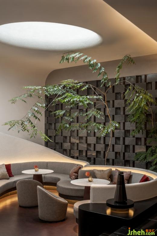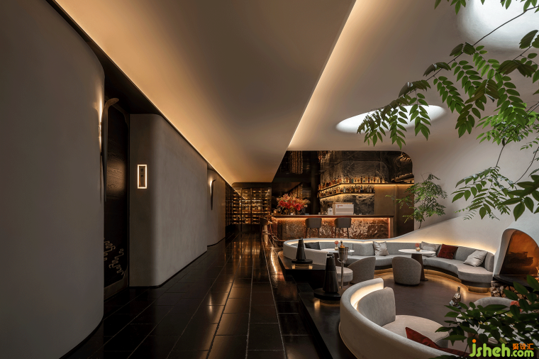 臨側(cè)潔凈的下沉區(qū)是一個柔軟的樂池,使人想起一個寂靜的山谷,流暢的弧面勾勒出的卡座有如一片燦爛的云景,聚集在山上的酒神頂禮者從高處俯視它,日月毫不吝嗇潑灑它的光輝,天花的開孔更具神性的哲思。