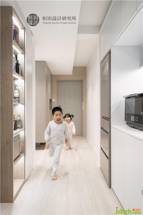 孩子由兒童房跑向家庭互動(dòng)區(qū),可見借用走廊的西廚吧臺(tái)
