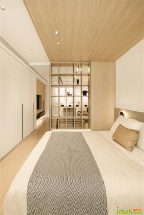 綜合以上考慮,設(shè)計師在主臥與客廳中間,設(shè)計了一套量身定制的移動書柜。書柜一側(cè)搭配可推拉隔板,這樣既可以保證白天的采光最大化,又可以解決夜晚的臥室隱秘性問題。