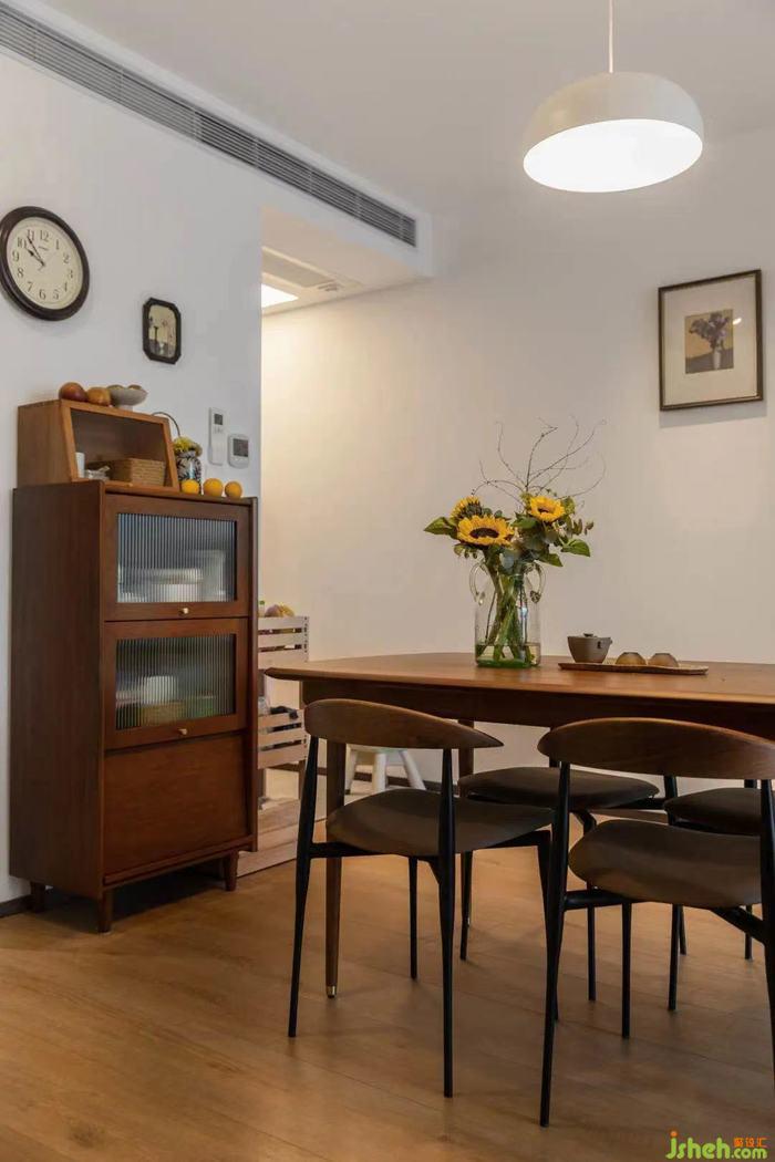 屋主希望餐廳區(qū)域能有一個(gè)儲(chǔ)物柜收納一些杯子茶具,咖啡壺等物品,室內(nèi)設(shè)計(jì)師在這個(gè)空間我們沒有再做定制,而是采用了小巧的成品柜。