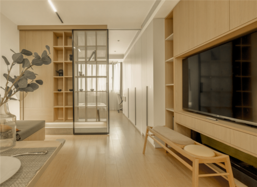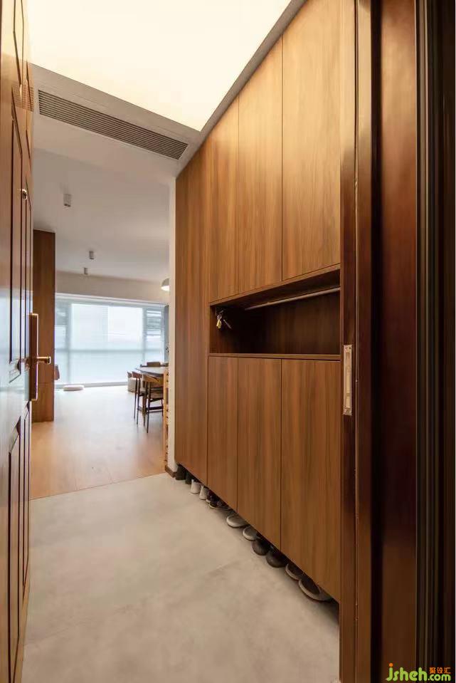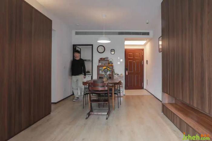室內(nèi)設(shè)計(jì)師根據(jù)屋主的喜好,整屋采用了胡桃色作為主色調(diào),玄關(guān)設(shè)置了頂天立地的高柜,為一家三口打造了充足的收納。
