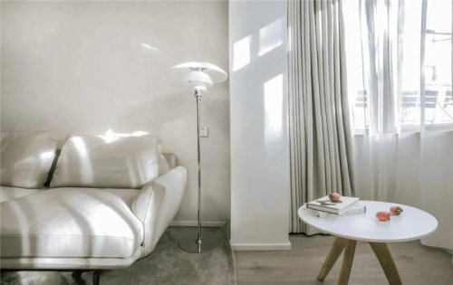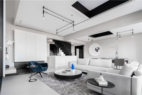 在房頂?shù)奶幚砩?,我們?nèi)∠酥袄蠚獾沫h(huán)形吊頂,一側(cè)的收納柜直通屋頂,室內(nèi)設(shè)計(jì)師像一面墻而存在,弱化體量感。梁下的空間也沒有浪費(fèi),做了一個(gè)窄柜,柜體采用白色,和梁融為一體。
