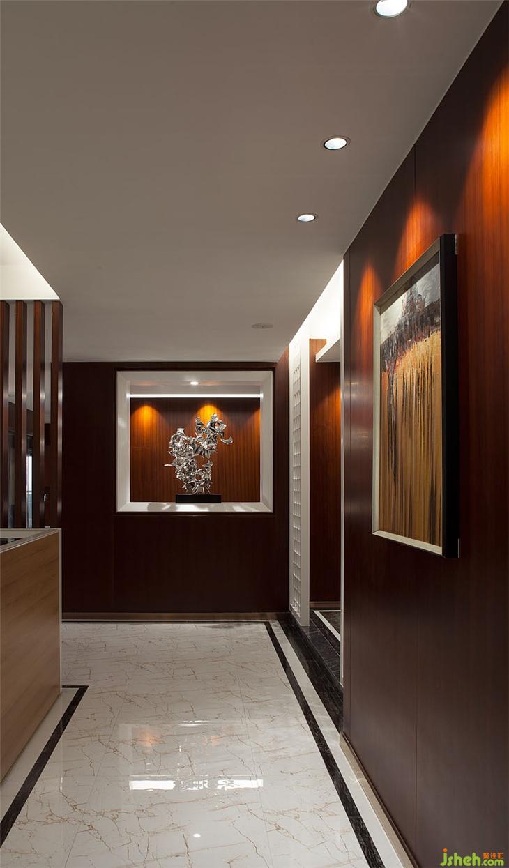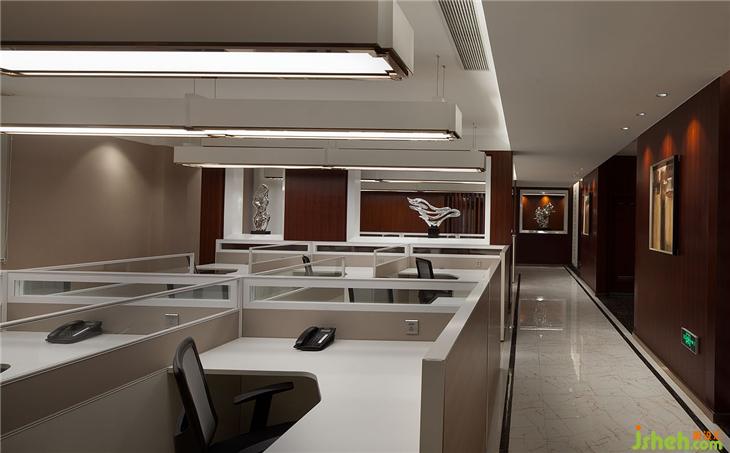暗紅色的木墻與茶白色的辦公桌形成色彩對比,與冷暖交錯的燈光一同增強空間的畫面感,造成一定的視覺沖擊,在安靜的辦公環(huán)境中增添一份生氣,使辦公者思維更加活躍,工作更加積極。墻面避免使用過多裝飾,簡單幾件造型簡單、質(zhì)感輕巧的飾品畫龍點睛,偶爾的空間留白襯托出主體的氣氛。