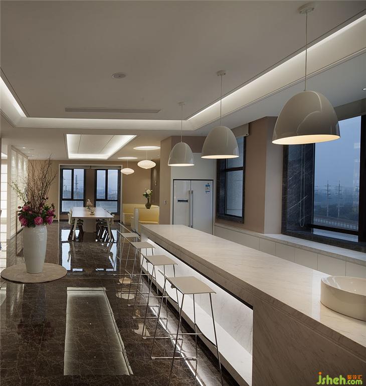 大理石地磚光可鑒人,利用鏡像將空間適當(dāng)延伸,擴(kuò)大了與客戶溝通交流的平臺,讓思維可以在這里得以無限延展與碰撞。天花燈兩兩相依,光芒閃爍,是營銷人員與客戶思想的共鳴。辦公室設(shè)計(jì)