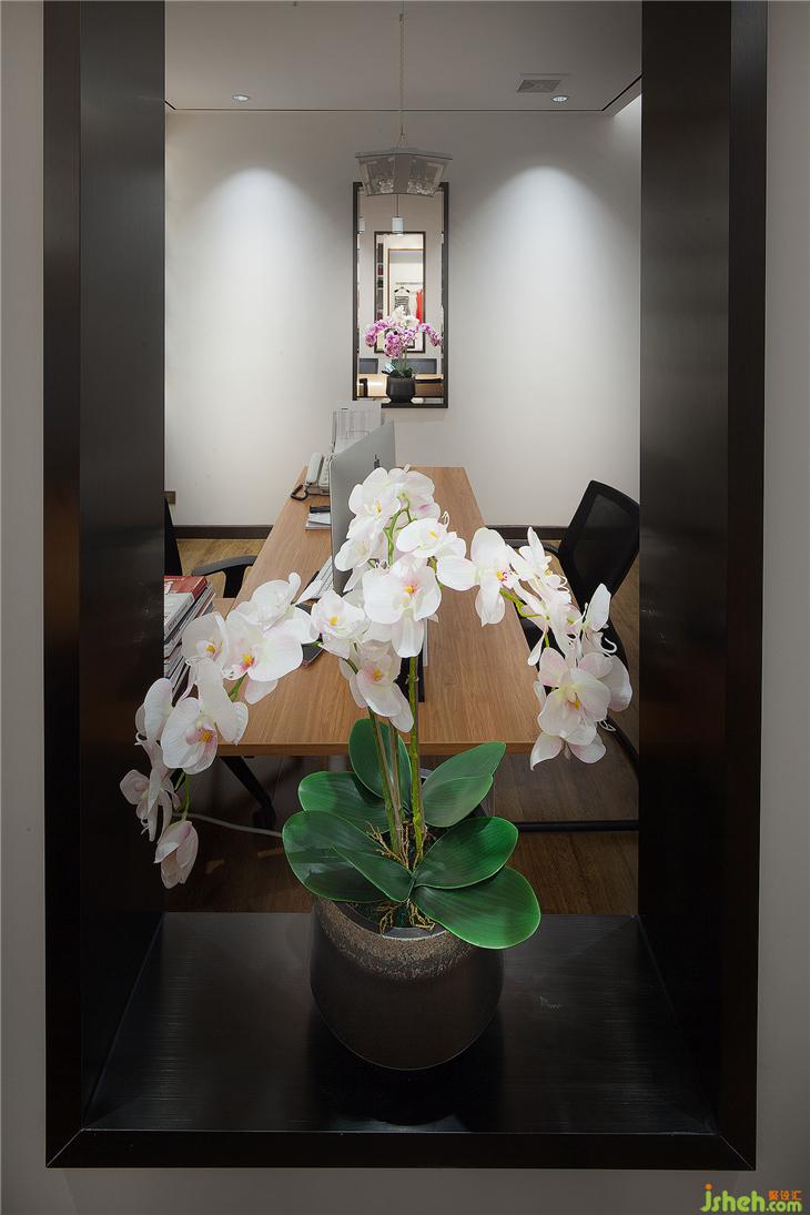 看似裝飾的壁窗實(shí)則暗藏玄機(jī),半開(kāi)放式的設(shè)計(jì)讓辦公區(qū)域采光更好,窗明幾凈。蝶蘭點(diǎn)綴,立顯品味。